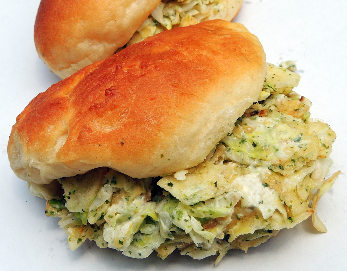 パンにポテトチップスのり塩、キャベツ、にんじんを挟み、マヨネーズと軽く辛子バターで味付け。